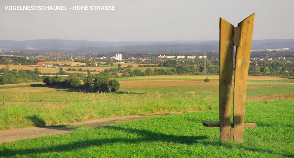 Die Hohe Straße folgt dem historischen Verlauf einer alten Handelsroute und führt als Höhenweg durch weite Landschaft. Schnell fühlt man sich ‚fern ab‘ und dem Himmel näher. Spektakuläre Weitblicke nach allen Seiten beeindrucken. Zugleich verraten Ausblicke zur Frankfurter Skyline, zum Kraftwerk Großkrotzenburg und den wachsenden Siedlungen im Tal, wie nah der Ballungsraum Rhein-Main noch ist. Im Osten des Ronneburger Hügellands wird es einsamer und die Hohe Straße verläuft durch ein kleines Waldgebiet. Verlässt man es, so überraschen auch hier wieder weite Blicke. Büdingen lag früher etwas abseits der alten Handelsroute, doch lohnt auch heute noch ein Abstecher in die malerische Altstadt.
