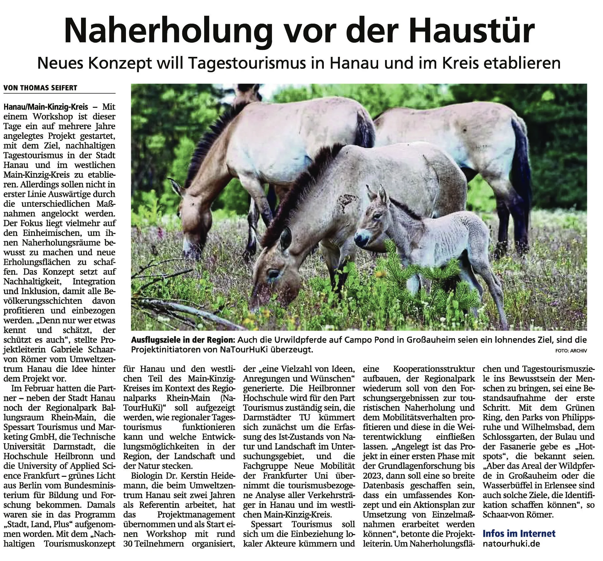 Das Projekt NaTourHuKi befasst sich mit der Entwicklung einer nachhaltigen Tourismusstrategie für den Landschaftsraum „Kinzigtal“ von Hanau bis Steinau an der Straße im Main-Kinzig-Kreis. Der Bedarf an regionalen Erholungsmöglichkeiten und Tourismusangeboten wird in den nächsten Jahrzehnten aufgrund der wachsenden Bevölkerung im Ballungsraum Rhein-Main und in der Stadt Hanau erheblich steigen.