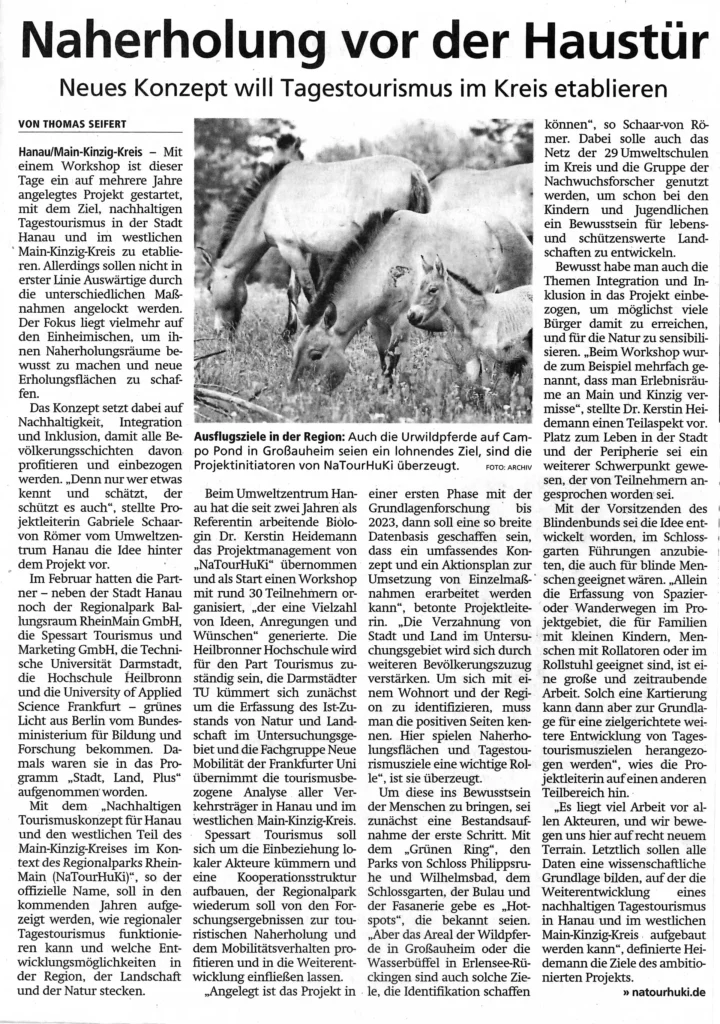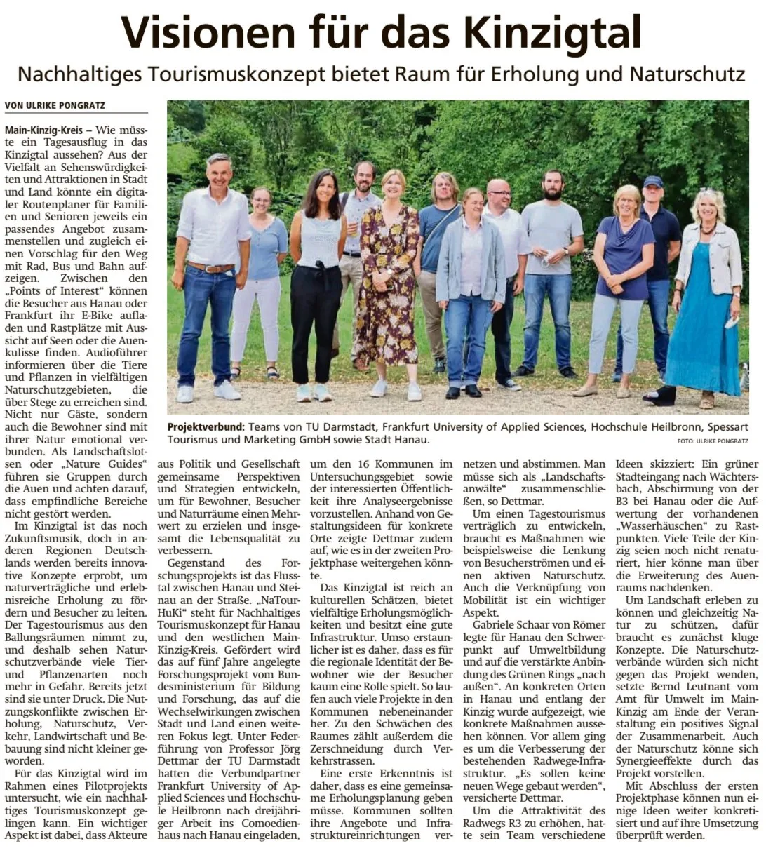Das vom BMBF geförderte Forschungsprojekt NaTourHuKi wird im Frühjahr 2025 auslaufen. Gemeinsam mit Akteur:innen vor Ort wurde in den letzten Jahren eine nachhaltige Naherholungs- und Tagestourismusstrategie für das „Kinzig-Auental“ von Hanau bis Steinau a. d. Straße entwickelt.
