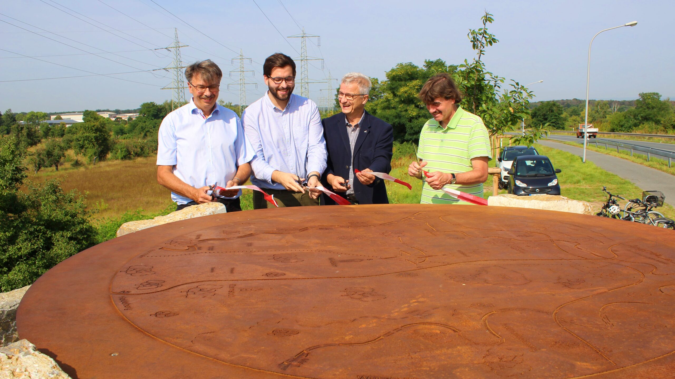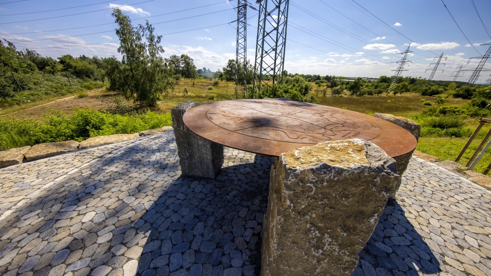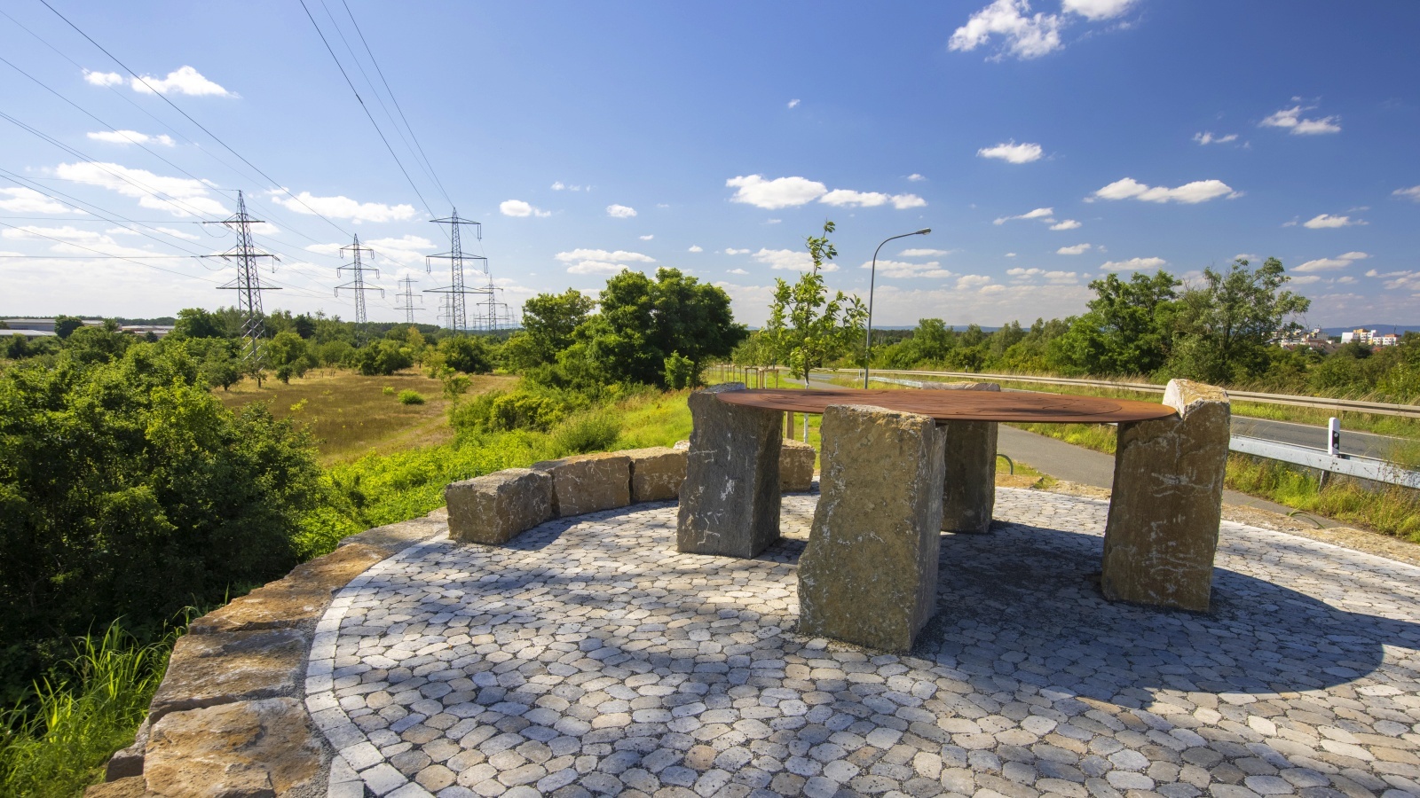 Der Aussichtspunkt ist mit  natürlichen und robusten Materialien ausgestattet. Er setzt Reihen von großen Muschelkalkblöcken ein, um eine erhöhte Position zu erreichen und natürliche Sitzmöglichkeiten zu bieten. Der Fokuspunkt, ein 2,5 Meter breiter Stahltisch mit einer gelaserten Karte der Region, sitzt auf vier großen Muschelkalkstelen. Diese beeindruckende Attraktion hilft neuen und bereits angereisten Rundroute-Reisenden, sich in der Region zu orientieren. Dieser Aussichtspunkt bietet einen guten Orientierungspunkt direkt am südwestlichen Teil der Rundroute und eine wertvolle Ergänzung zu den nahen gelegenen Aussichtspunkten auf dem Oberwaldberg.