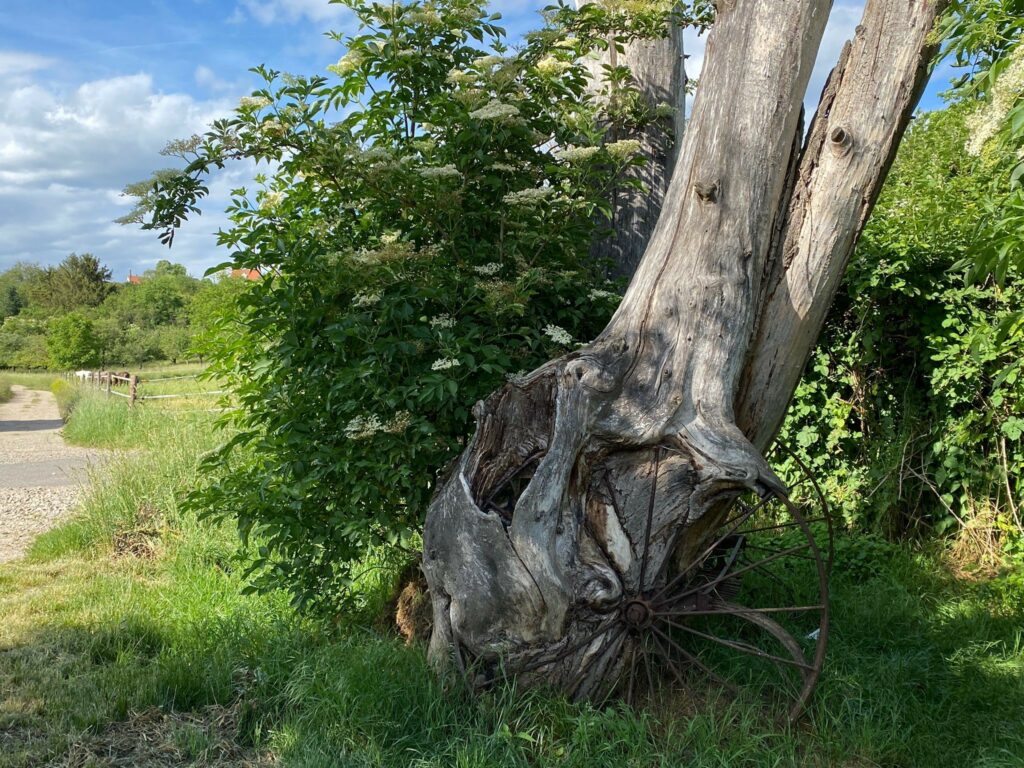 Doch viel spektakulärer ist, was sich just gegenüber präsentiert: Ein alter Heuwender, eingewachsen in eine Flussweide. Weiter geht es durch einen Streuobstgarten und an der historischen Straßenmühle entlang.