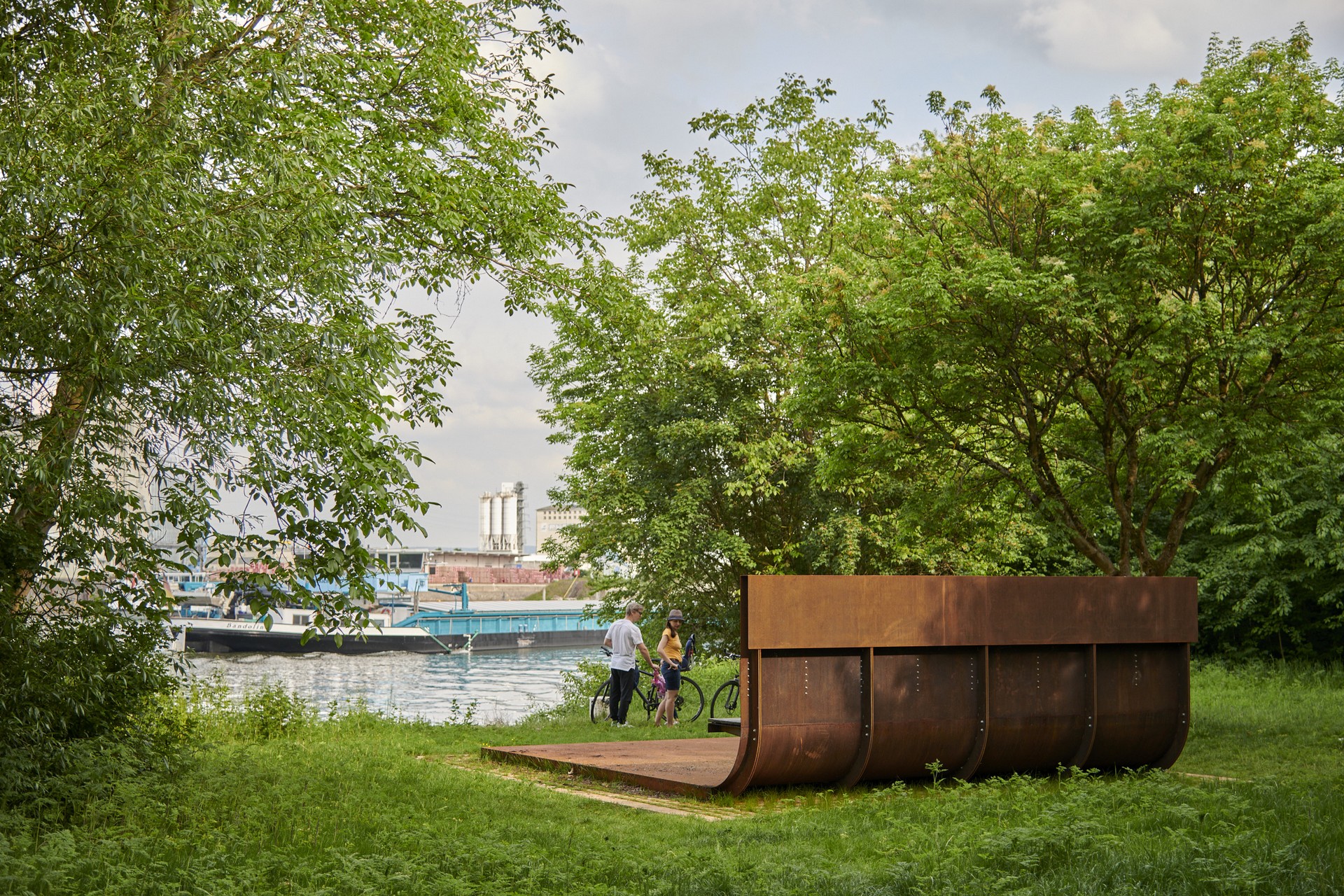 Konstruiert aus Cortenstahlplatten dient das leicht über dem Boden „schwebende“ Sitzobjekt als überdimensionale Ruhebank, die vom Steinheimer Mainufer aus einen spannenden Ausblick auf den nördlichen, flussseitigen Teil des Hanauer Hafens mit dem alten Zollamtsgebäude und seiner großen Uhr bietet. Mit einer Größe von 4,80 mal 5,50 Meter ist der „Hafenbalkon“ nicht nur ein besonderer Erlebnispunkt, sondern ermöglicht es dem Besucher, den Fluss aus einer neuen Perspektive zu betrachten. So sind von hier die im Hafen ab- oder zuladenden Frachtschiffe ebenso gut zu beobachten, wie zahlreichen Fluss-Kreuzfahrtschiffe.
