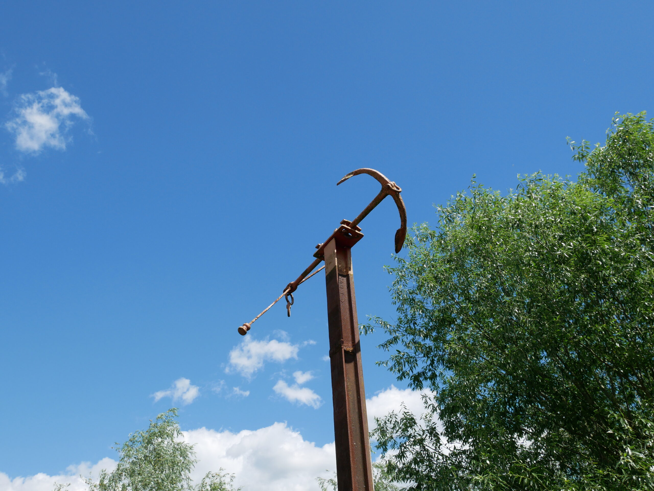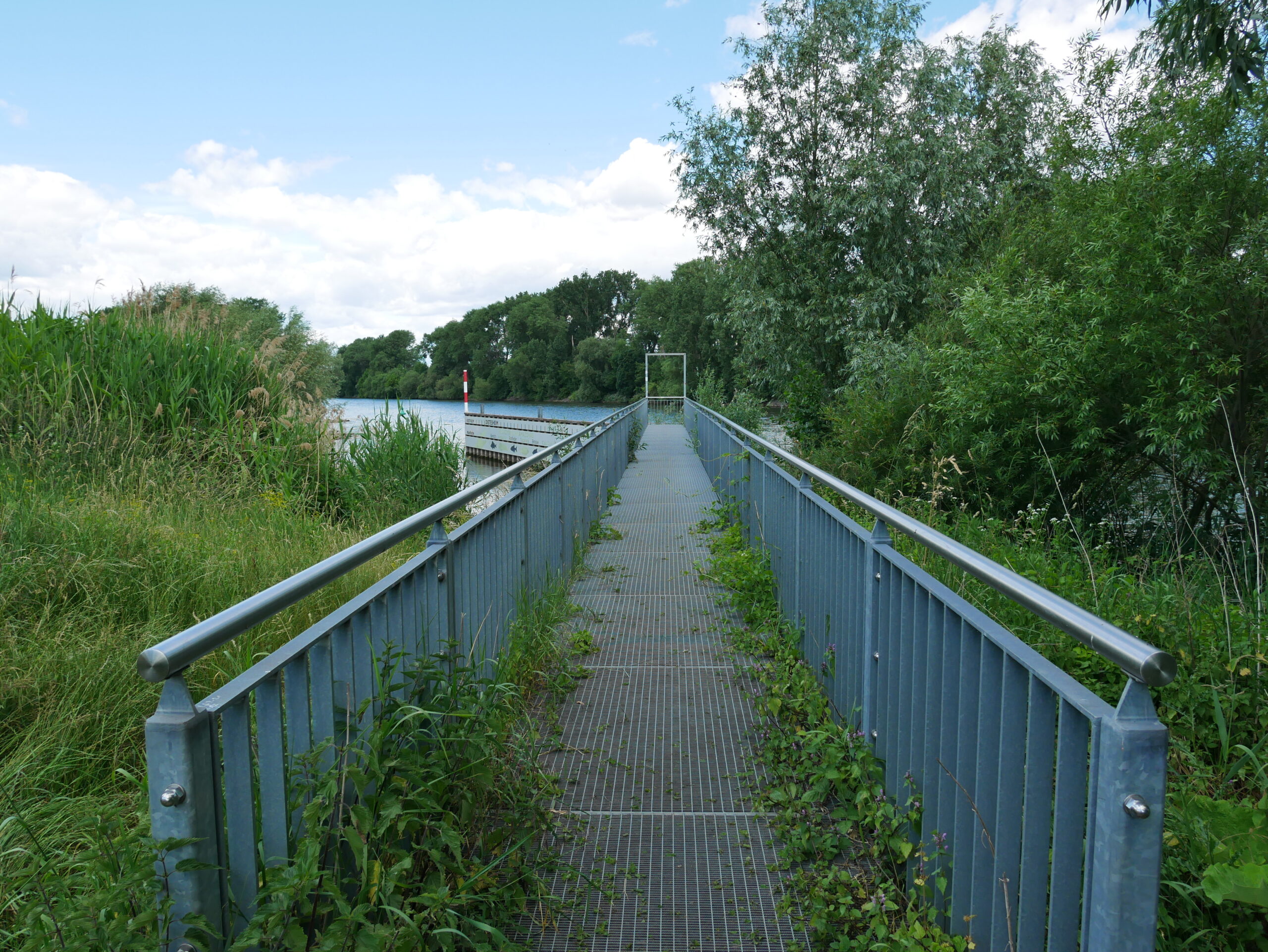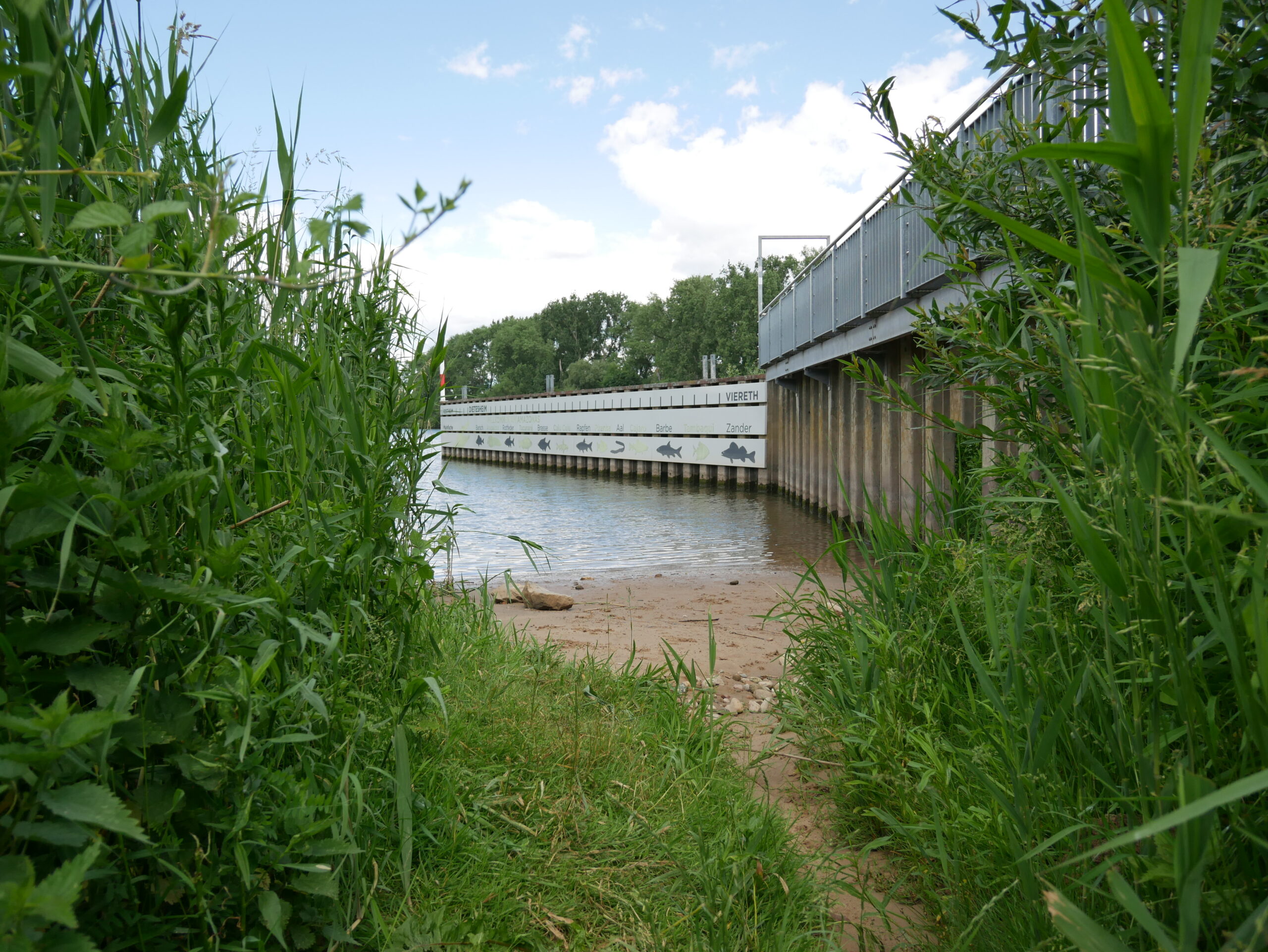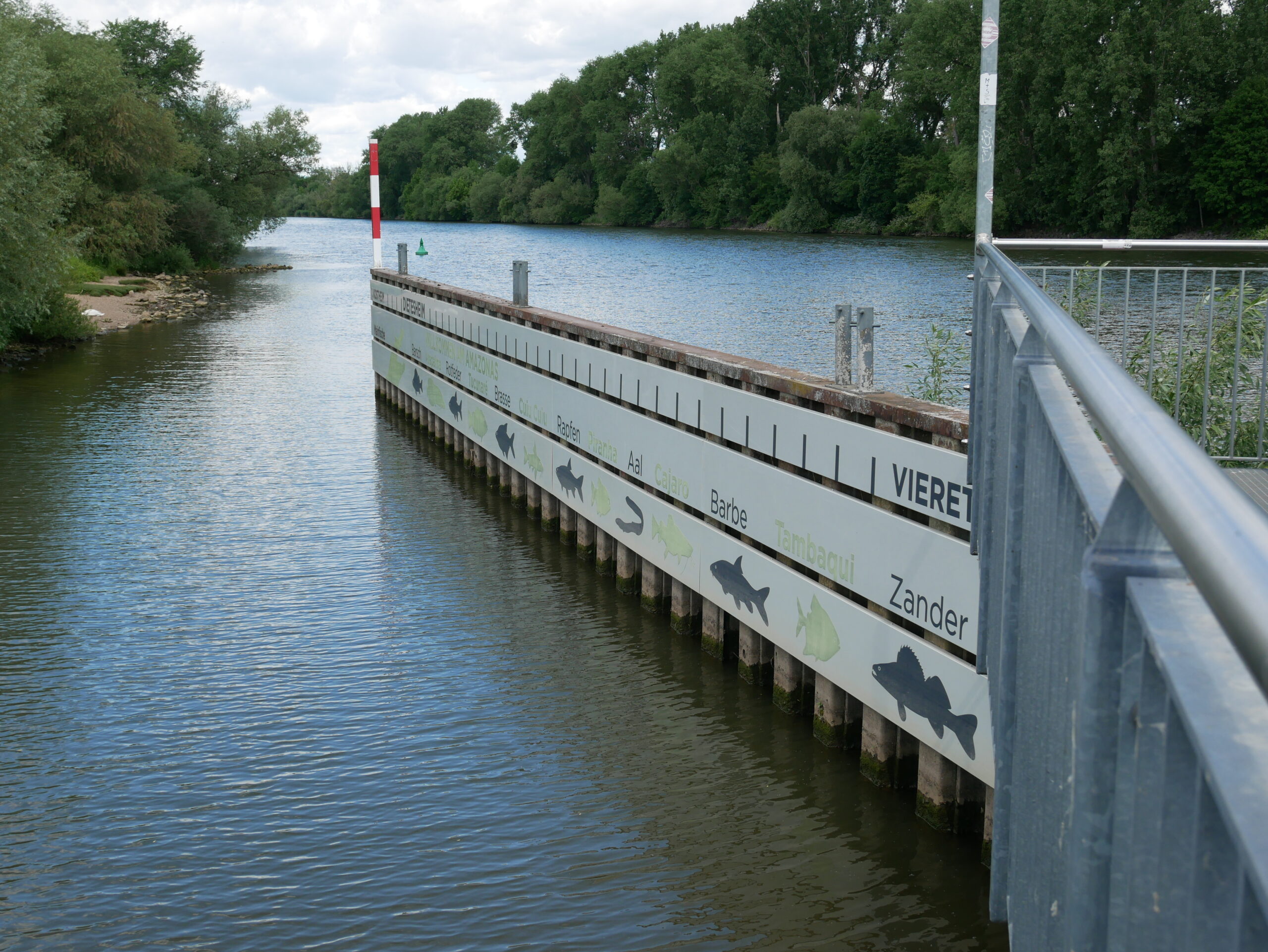 Auf der Spundwand in grau dargestellt sind die bedeutendsten Fischarten des Mains zu sehen. Die Markierungen der obersten Tafel stehen für die 32 Staustufen, die die Fischwanderung beeinträchtigen. Die Aussichtsplattform ermöglicht den Blick auf den Main und seine Ufer. Typische Poller auf der Spundwand und ein Mast an der Einfahrt unterstreichen den Hafencharakter.