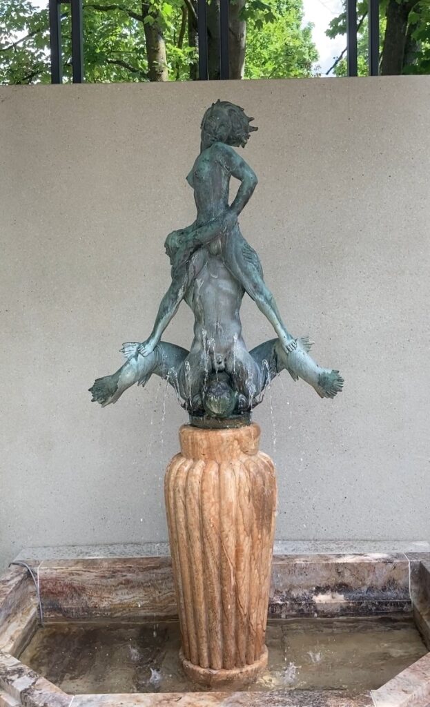 Ein spannendes Kunstwerk, das laut Unterlagen des Rüsselsheimer Stadtarchivs aus den Händen eines unbekannten Künstlers stammt. Ursprünglich stand die Bronzeskulptur mit Brunnen in einem Wintergarten zwischen den beiden Trakten des Opelvillen-Ensembles.