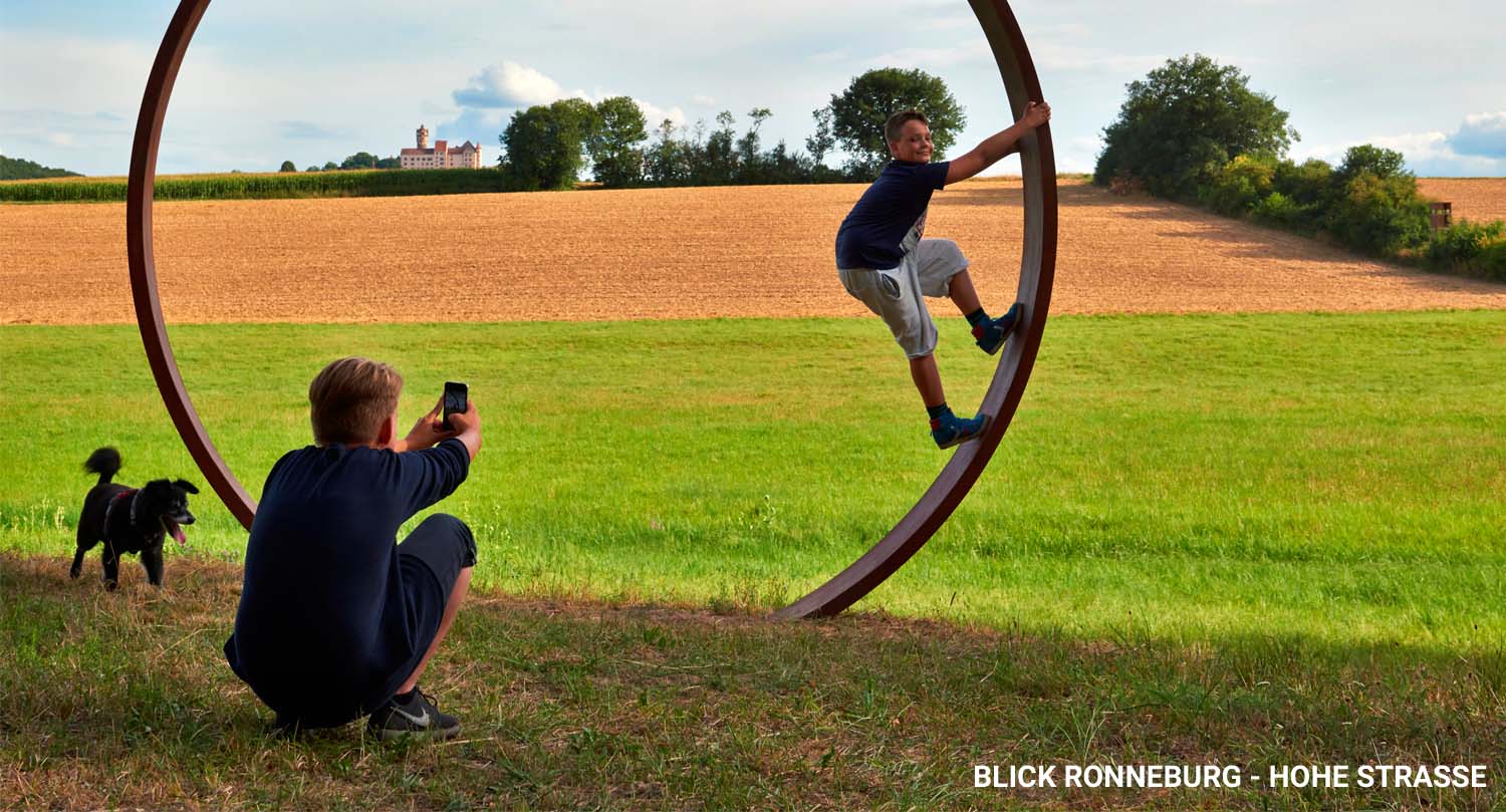 Die Regionalpark-Route Hohe Straße folgt dem historischen Verlauf einer alten Handelsroute und führt als Höhenweg durch weite Landschaft. Schnell fühlt man sich ‚fern ab‘ und dem Himmel näher. Spektakuläre Weitblicke nach allen Seiten beeindrucken. Zugleich verraten Ausblicke zur Frankfurter Skyline, zum Kraftwerk Großkrotzenburg und den wachsenden Siedlungen im Tal, wie nah der Ballungsraum Rhein-Main noch ist. Im Osten des Ronneburger Hügellands wird es einsamer und die Hohe Straße verläuft durch ein kleines Waldgebiet. Verlässt man es, so überraschen auch hier wieder weite Blicke. Büdingen lag früher etwas abseits der alten Handelsroute, doch lohnt auch heute noch ein Abstecher in die malerische Altstadt.