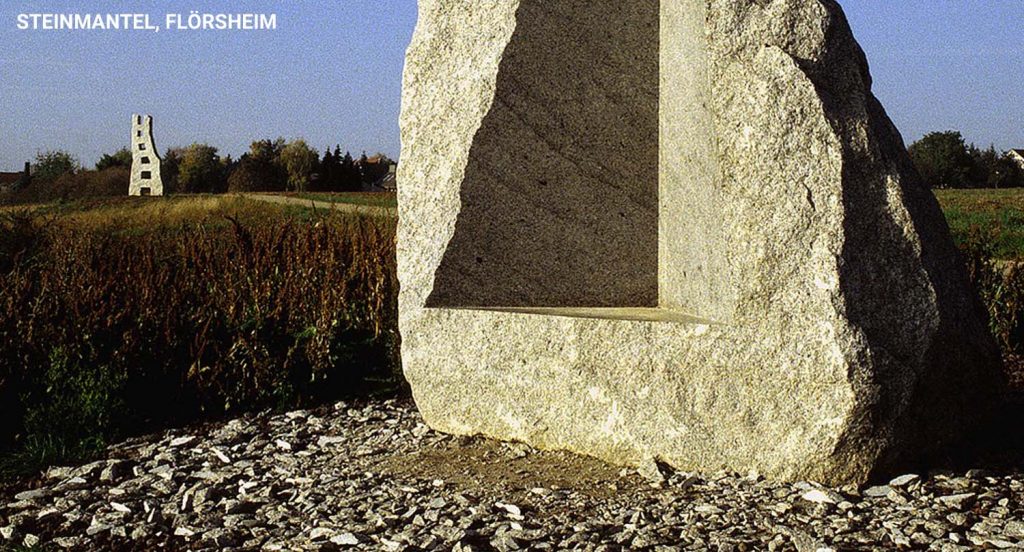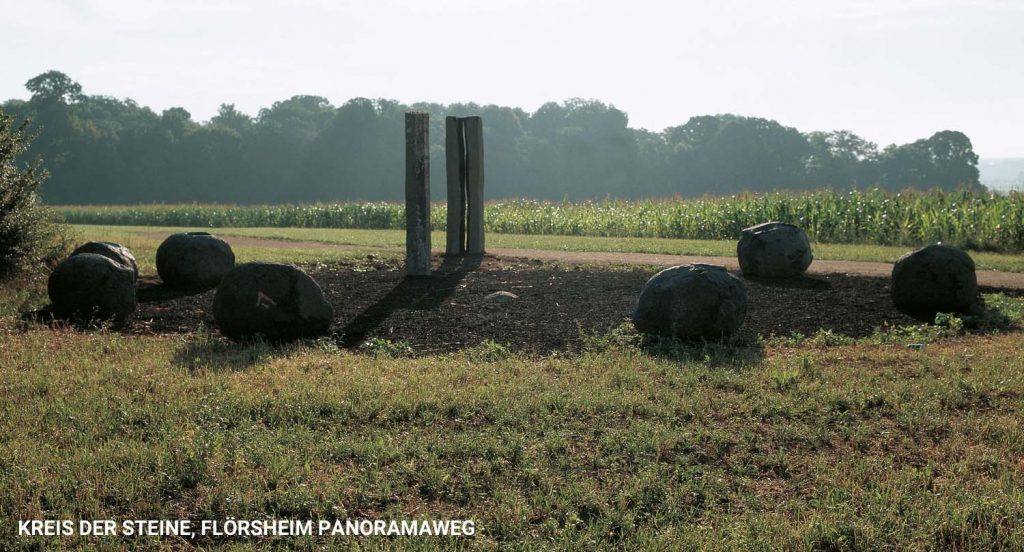 Stopper – Drei Gemarkungsgrenzen stoßen hier zusammen. Auf einem kleinen Platz haben sich drei Steine versammelt. Ein Ort der Kommunikation? Eine Insel im wildwachsenden Ackergrün? Oder ein Zimmer mit Ausblick? Georg Hüter, Bildhauer aus Aschaffenburg, lässt den Betrachter im Unklaren. Aber: Sein Werk verweist auf die Zukunft. Mit dem Apfelbäumchen zwischen den mächtigen Steinen wird „die Natur korrigierend ihren Beitrag leisten“.