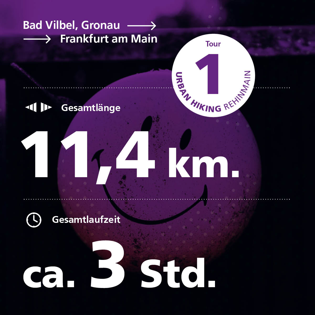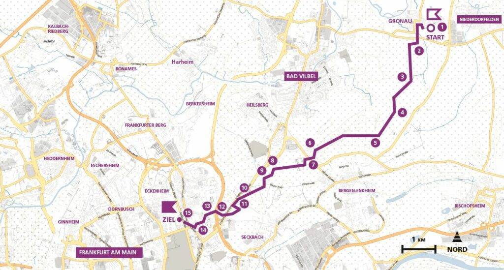 Die Tour führt vom Bahnhof Bad-Vilbel-Gronau auf fast direktem Weg nach Frankfurt. Vom Berger Rücken bieten sich dabei großartige Ausblicke ins Maintal und auf die Frankfurter Skyline. Obwohl ich mich die meiste Zeit zwischen Feldern und Obstbäumen bewege und erst auf den letzten Metern die Stadt betrete, ist die Stadtlandschaft zu meinen Füßen omnipräsent: In den Hochspannungsmasten, die vom Kraftwerk Großkrotzenburg auf Frankfurt zuführen ebenso wie im Hochhaus der Unfallklinik, das mir zur Landmarke wird oder in dem feinen Wegenetz, das die zahllosen Hundebesitzer der Großstadt auf der Suche nach Auslauf geschaffen haben.