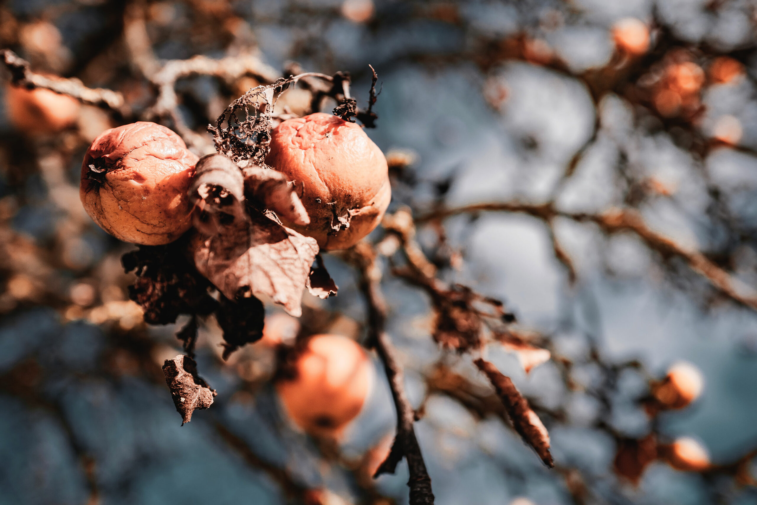Und so tragen alle dazu bei, dass es auch einen Weg gibt, eine traumhafte, ausgetretene Linie, die mal in einem Feldrain verläuft, sich dann zwischen einer Reihe Obstbäume hindurchwindet oder am Zaun eines Gartens entlang, sich auf offener Wiesenfläche fast verliert, geradewegs auf einen Strommast zuführt… das französiche Wort für Trampelpfad ist ligne du désir… Meine ligne du désir erreicht die Berger Warte und läuft dann auf das Umspannwerk Nord zu. Der Weg scheint zunächst geradewegs in das Werk hinein zu führen, verschwenkt dann aber unvermittelt um 90 grad mitten hinein in den Acker und als er seine Richtung wiedergefunden hat, sind die Strommasten verschwunden und mit ihnen die Kabel im Himmel. Sie laufen ab jetzt wohl unterirdisch weiter, vom höchsten Punkt des Stadtgebietes leicht bergab bis in die Stadt, wie mein Weg. Mainhattan hat nochmal einen großen Auftritt, dann schieben sich Gehölzsäume vor die Skyline und nach der Überquerung des Berger Weg tauche ich ein in die Welt der verwilderten Obstgärten und verwunschenen Rückzugsorte an den Ausläufern des Lohrberg.