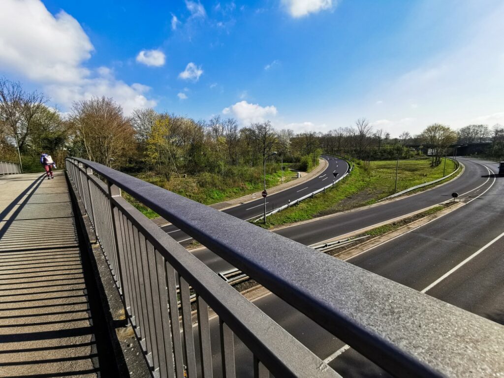Nach 30 m rechts in den Fußweg. Unter der Bahn durch, dann links auf die Fußgängerbrücke über die Leipziger Str.