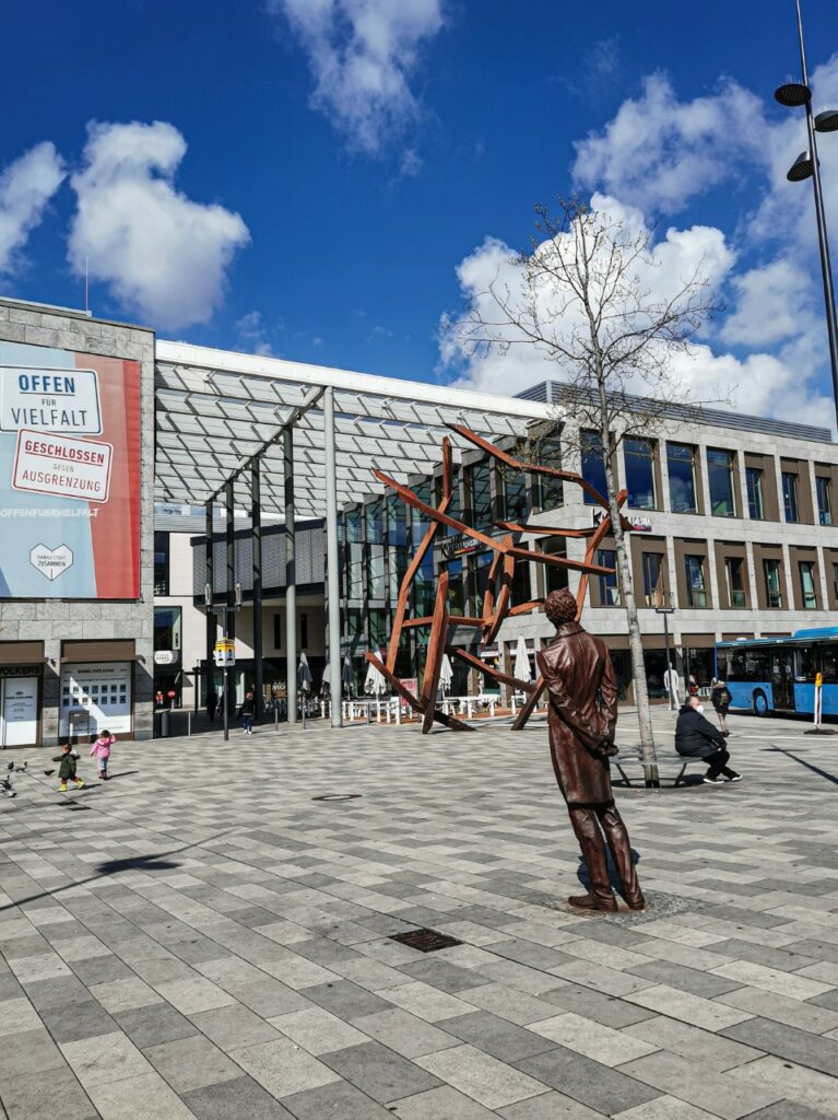 Den Übergang vom ersten zum zweiten Hanau markiert heute der Torbogen des Einkaufs- und Kulturzentrums FORUM. Durch ihn hindurch gelange ich in die Fußgängerzone und auf den wirklich großen Marktplatz, den ich diagonal überquere, um in der versteckten und total verschachtelten Marktpassage zu verschwinden, die mich auf dem brandneu gestalteten Platz vor der wallonisch-niederländischen Kirche ausspuckt: Weil in Hanau alles doppelt ist, bauten sich die Neustädter auch eine doppelte Kirche, eine für Gottesdienste auf Niederländisch und eine für Messen auf Französisch. Weil sie den gleichen Glauben teilten, verschränkten sie die Gebäude aber ineinander und teilten sich den Glockenturm. Als nach dem Krieg beide Kirchen zerstört waren, fusionierten die Gemeinden und bauten nur die kleinere der beiden Kirchen wieder auf, während die andere als Mahnmal Ruine blieb – eine wirklich einmalige Gebäudekonstellation, die durch die neue Platzgestaltung gewürdigt werden soll.
