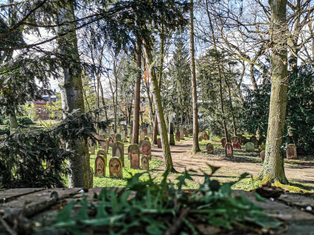 In der Jahnstraße blicke ich, über eine niedrige Mauer hinweg, in den Jüdischen Friedhof. Die dicht beieinanderstehenden Grabsteine aus rotem Sandstein bilden einen deutlichen Kontrast zum grünen Waldboden und dem Moosbewuchs, der sie unterschiedlich stark überzieht. Die beinahe formgleichen Steine sind allesamt nach Südwesten ausgerichtet und tragen zu mir hin Seite keine Inschrift, so dass ihr Charakter einer stummen Zeugenschaft besonders deutlich zutage tritt. Die Einheitlichkeit dieses Ortes setzt sich im weiteren Verlauf der Straße fort, die von zahlreichen, rötlich verklinkerte Gründerzeitvillen gesäumt wird.