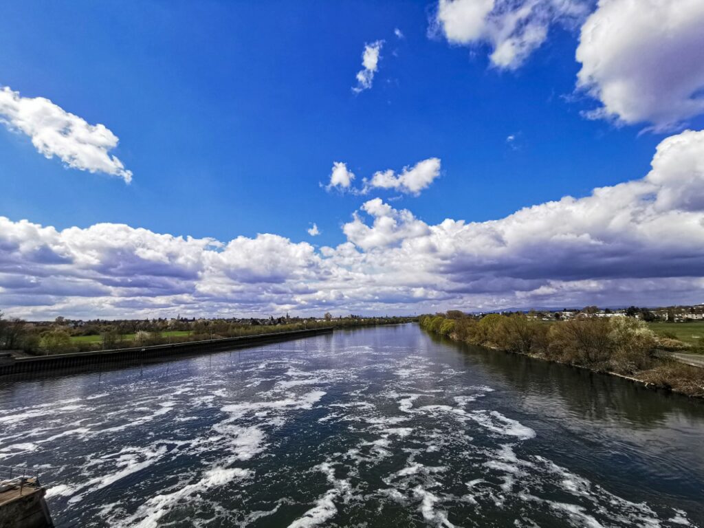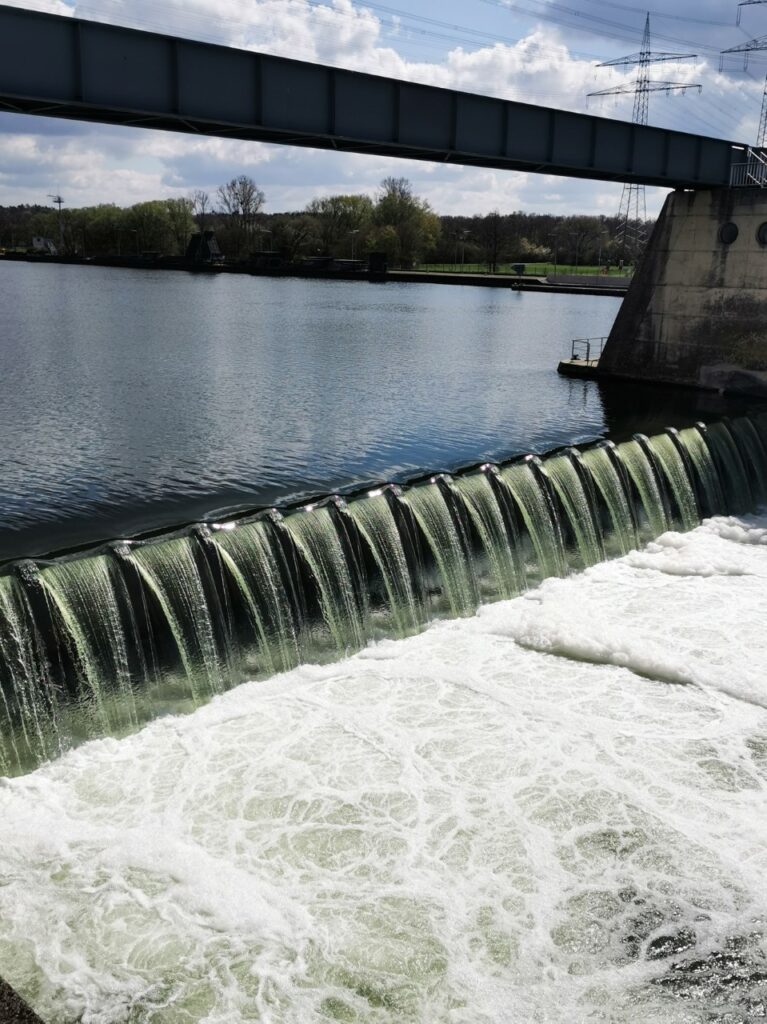 Vom Treppenabsatz der Staustufe blicke ich auf das herabfallende Wasser. Im Unterschied zu einem natürlichen Wasserfall fällt das Wasser hier in dicken, klaren Striemen hinunter, so konstant, dass sie gleichermaßen statisch wie fallend wirken. Erst die aus der Tiefe aufsteigenden Strudel geben Auskunft über die ungeheure Dynamik des Vorgangs. Die aufsteigenden Strudel sind wie Explosionen in Zeitlupe und erinnern mich darin an die Wolken, die aus den Kühltürmen von Kokereien aufsteigen, wenn der Koks gelöscht wird. Ich starre wie hypnotisiert in die Strudel, reiße mich dann los und steige die restlichen Treppen hinauf auf den stählernen Steg, der als Fuß- und Radweg über die Staustufe gelegt ist. Plötzlich Linearität und Engführung, quer zum Fluss kommen mir Radfahrer und Jogger entgegen. In der Ferne, flussabwärts, die Frankfurter Skyline. Immer noch das Rauschen der Striemen, die auf die Wasserfläche treffen, aber leiser jetzt. Dann ein Schiff das unter mir stillsteht, der riesige Stahlkasten mit kaum handbreitem Abstand zu den Wänden der Schleusenkammer. Die Schleusenflügel öffnen sich und der Schiffkörper schiebt sich, Zentimeter um Zentimeter, aus der Kammer hinaus zurück in den Fluss. Die Staustufe Mülheim ist wirklich „großes Kino“ für die Sinne!