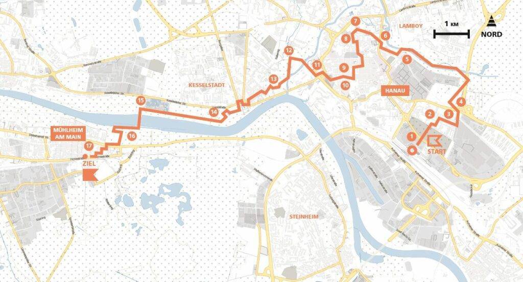 Diese Tour (und ihre Beschreibung) kommt nicht ohne etwas ausführlichere historische Informationen aus. Die komplizierte, im Krieg völlig zerstörte und manchmal sperrige Stadt Hanau muss nicht nur ergangen, sondern auch erklärt werden, so reich ist sie an Geschichten, Widersprüchen und regionalen Bezügen. Dass dahinter der Weg als Hauptdarsteller gelegentlich zurücktritt, habe ich ausnahmsweise gerne in Kauf genommen. Er kann verstanden werden als Würdigung einer Stadt, in der sich wie in einer Nusschale die Dramen der modernen und frühmodernen Stadtentwicklung abgespielt haben und die trotz allem (oder gerade darum?) nie ihren Glauben an ein Gemeinwesen verlor.