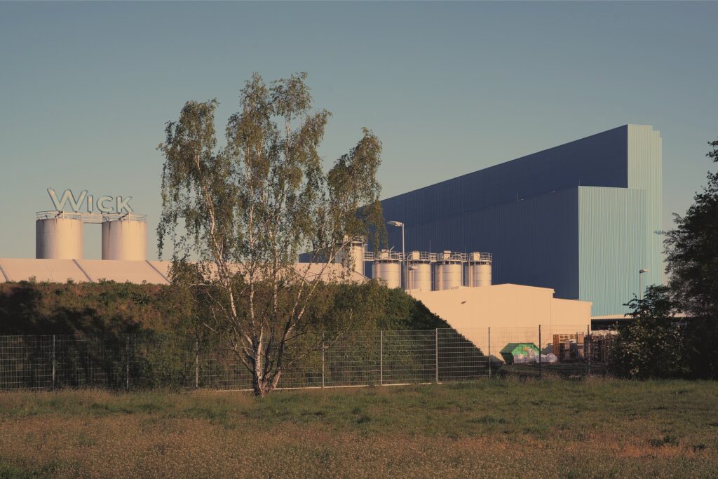 Am Bahnübergang Mittelstraße scheint die Zeit still zu stehen. Die Güterzüge sind lang und fahren langsam. Im Hintergrund rauscht die A67 und auf einer höher gelegten Trasse rauscht der Regionalexpress über das Gütergleis hinweg. Ein komplizierter Verkehrsknotenpunkt, in dem ich mittendrin und zugleich an der einzigen Stelle stehe, an der sich von den beteiligten Systemen auch mal zwei begegnen (und nicht räumlich, sondern zeitlich getrennt werden – erst die Züge, dann alle anderen). Das hat etwas Altmodisches und Beruhigendes. Die Wartenden scheinen das zu spüren. Sie sind jedenfalls sehr geduldig und scheinen die Auszeit an der Schranke zu genießen. Auf der Procter & Gamble-Straße überquere ich die A67 uns stehe schließlich vor dem Tor zur großen Wick-Schachtel.