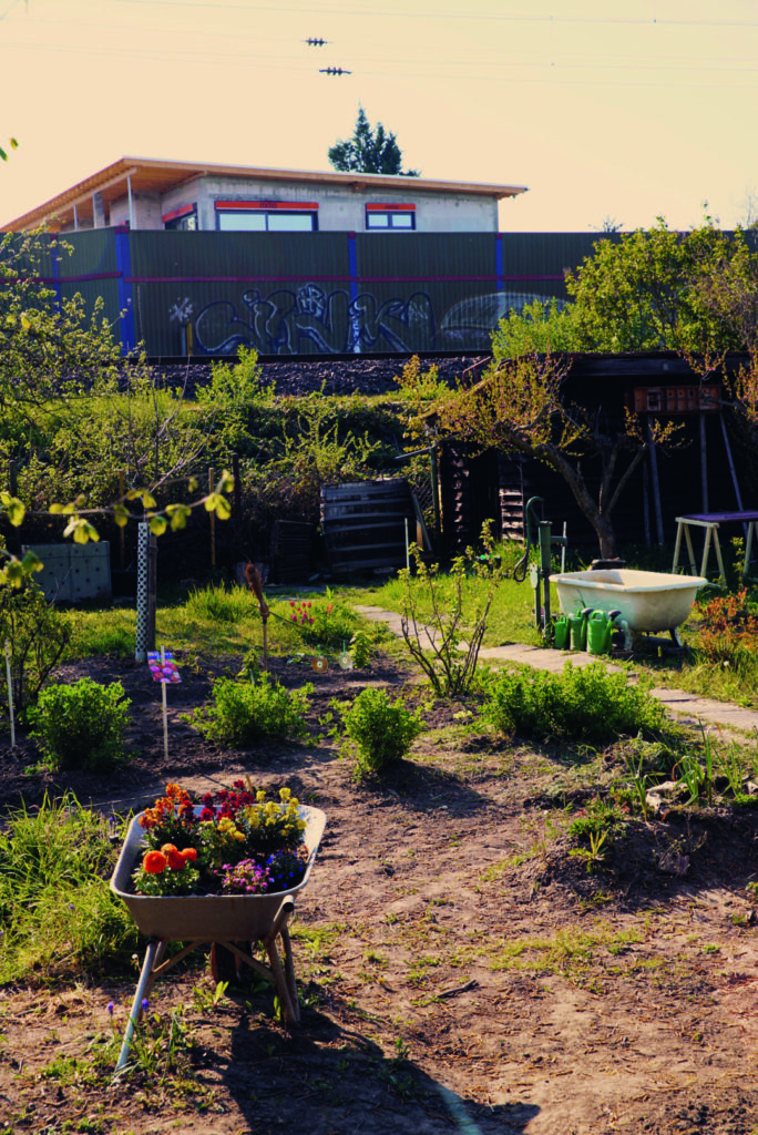 Der vielleicht spektakulärste Blick der ganzen Tour ist schon ein Rückblick und zugleich der Auftakt zu einer der schönsten Wegsequenzen der Tour: Von der Überführung der B44 (Frankfurter Straße) über die A67 aus gesehen, erscheint die blaue Box wie eine Fata Morgana hinter der Waldkulisse, die im Auffahrtsohr der Autobahn gewachsen ist. Das Asphaltband nimmt den Blick mit in die Tiefe und im Vordergrund zu Füßen des Betrachters öffnet sich ein haushohes Tor in einer völlig überwucherten Lärmschutzwand. Ich schreite hindurch und stehe inmitten der Mietergärten der Siedlung Danziger Straße, zwischen Bohnenstangen und Kürbissen, im Niemandsland zwischen Bahntrasse und Autobahn (das gesamte Quartier hat tatsächlich keinen Namen, weshalb es von der Stadtplanung behelfsweise „Bereich nördlich der Bahn“ genannt wird).