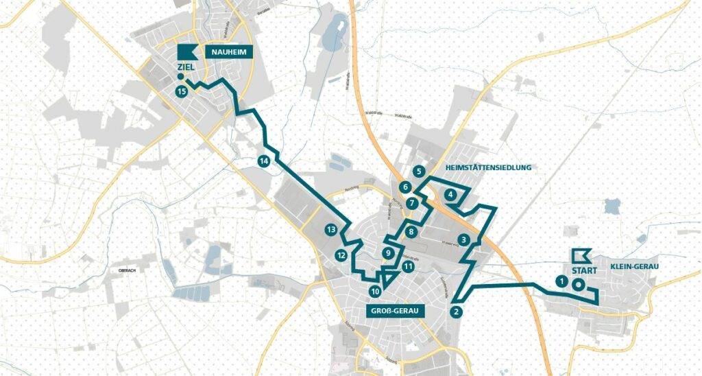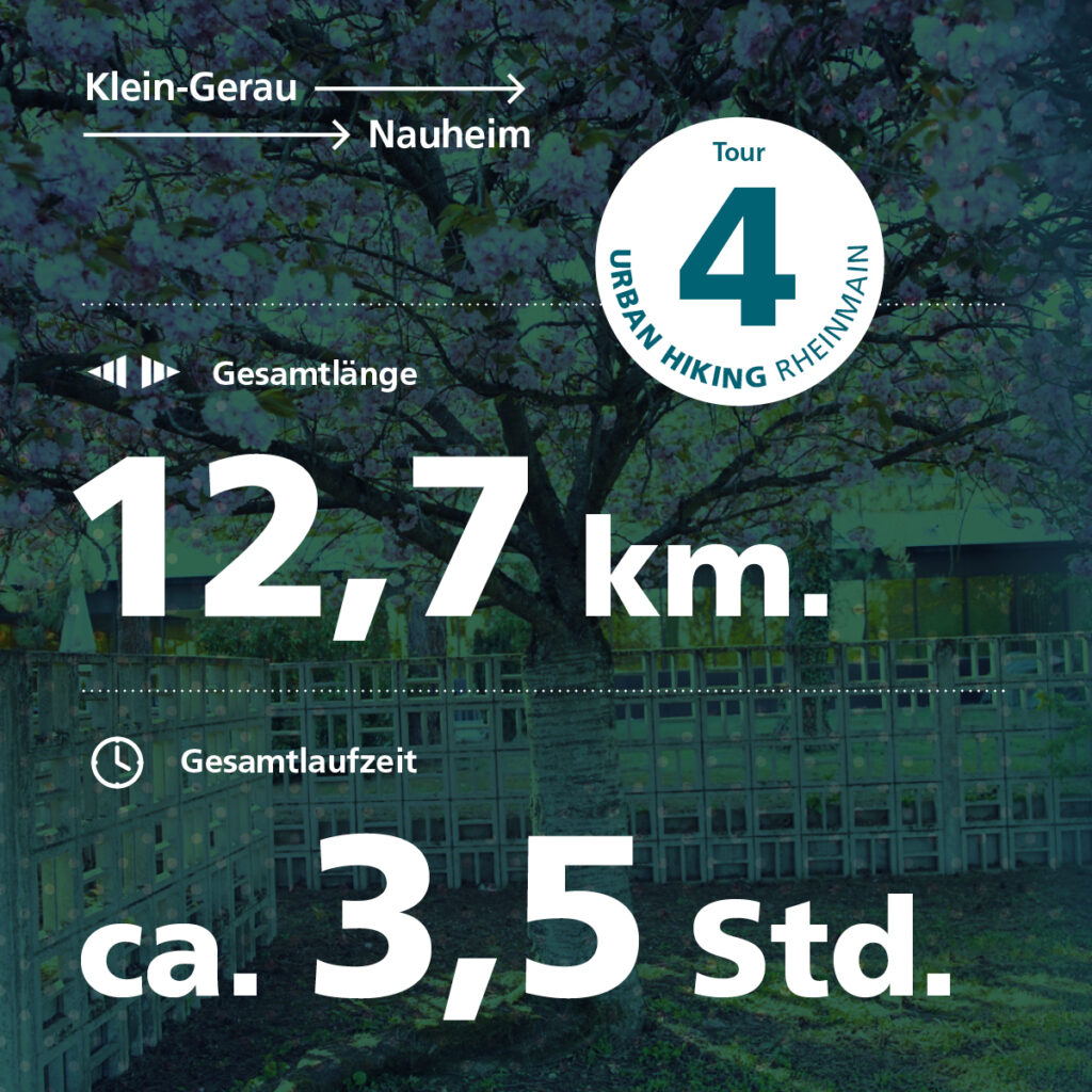 Den Bahnhof Klein-Gerau verlassen und am Fußballplatz entlang nach Osten gehen (von Frankfurt kommend in Fahrtrichtung). Rechts durch die Bahnunterführung gehen und geradeaus bis zur Hauptstraße. Rechts abbiegen und dem Weg, unter der AB hindurch, 1,8 km folgen.