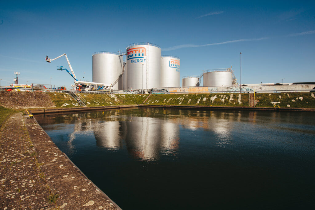 Ich erhasche eine Blick auf die riesige Flugzeugheckflosse, die den Parkplatz der Bremsen- und Räderwerkstatt der Lufthansa am Ende der Daimlerstraße einnimmt und verschwinde dann in dem schulterbreiten Durchgang namens Querstraße 80, der zum Hafenbecken führt. Ich umrunde das Hafenbecken mit Blick auf die Benzintanks von ROTH mit der tollen, blauroten Schrift auf silbernem Grund, gelange über die Querstraße 87 auf die Dieselstraße und gehe auf der rechten Straßenseite (wichtig!) bis vor zur Carl-Benz-Straße. An der Ecke Adam-Opel-Straße – bald habe ich alle Helden der deutschen Motorisierungsgeschichte beisammen – steht eine kleine Bude mit Spitzdach und Laubenanbau: „Le Berbére“ mit seinem Angebot nordafrikanischer Spezialitäten (u.a. frische Falafel) ist ein untrüglicher Hinweis auf die Existenz von Hipstern. Sie „verbergen“ sich wohl in einigen der umgebauten Fabrik- und Lagerhäuser und außerdem in dem die Kreuzung dominierenden UFO. Das gleichzeitig an Bauhaus und Brutalismus erinnernde Gebäude mit den drei runden Ecken und der maulartigen Öffnung zur Kreuzung beherbergte lange Zeit den Cocoon-Club von Technolegende Sven Väth, dessen gleichnamige Produktionsfirma ebenfalls im Haus residiert. Ich erklimme die Böschung des Ufoeingangs (toller Blick auf die weitläufige Kreuzung), gehe dann einmal um das Haus herum und anschließend die Adam-Opel-Straße entlang.