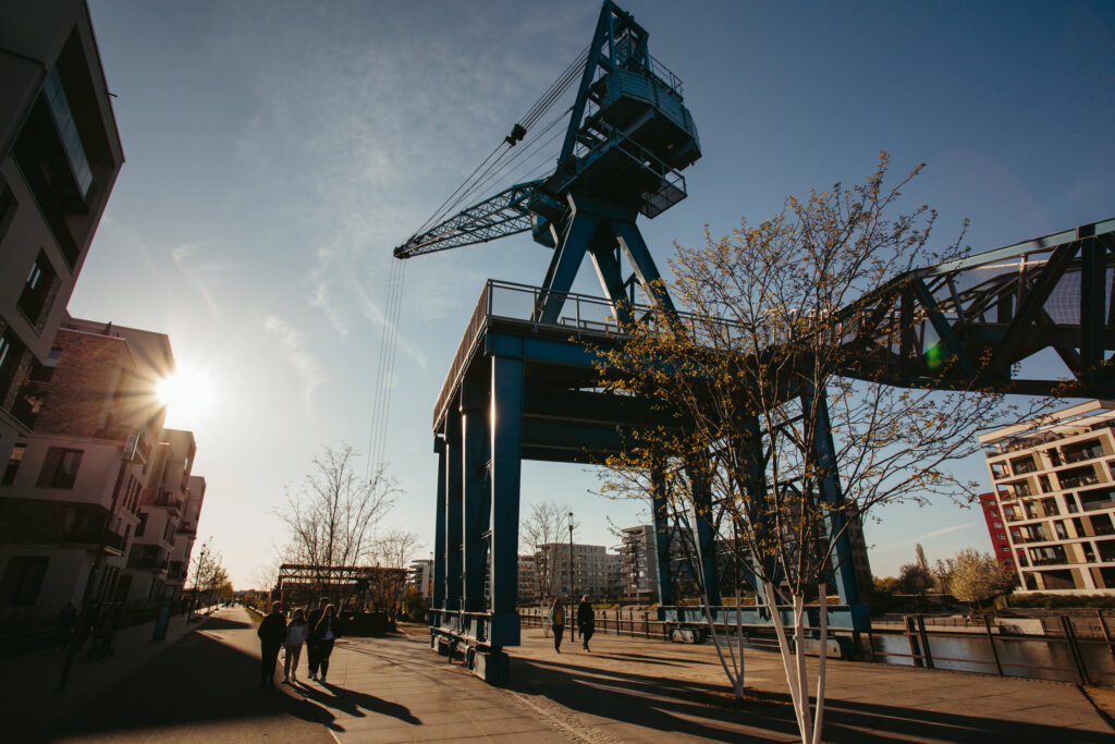Nach 350 m (hinter den Öltanks) führt links die Querstraße 72 unter der Schranke hindurch zum Hafenbecken, von wo Pfade neben den Gleisen auch wieder hinausführen. Jedoch, da es sich dabei um Hafengelände handelt, folgt diese Wegbeschreibung der Franziusstraße 100 m weiter und biegt dann links in die Intzestraße ein, dann wieder links in die Schmickstraße.