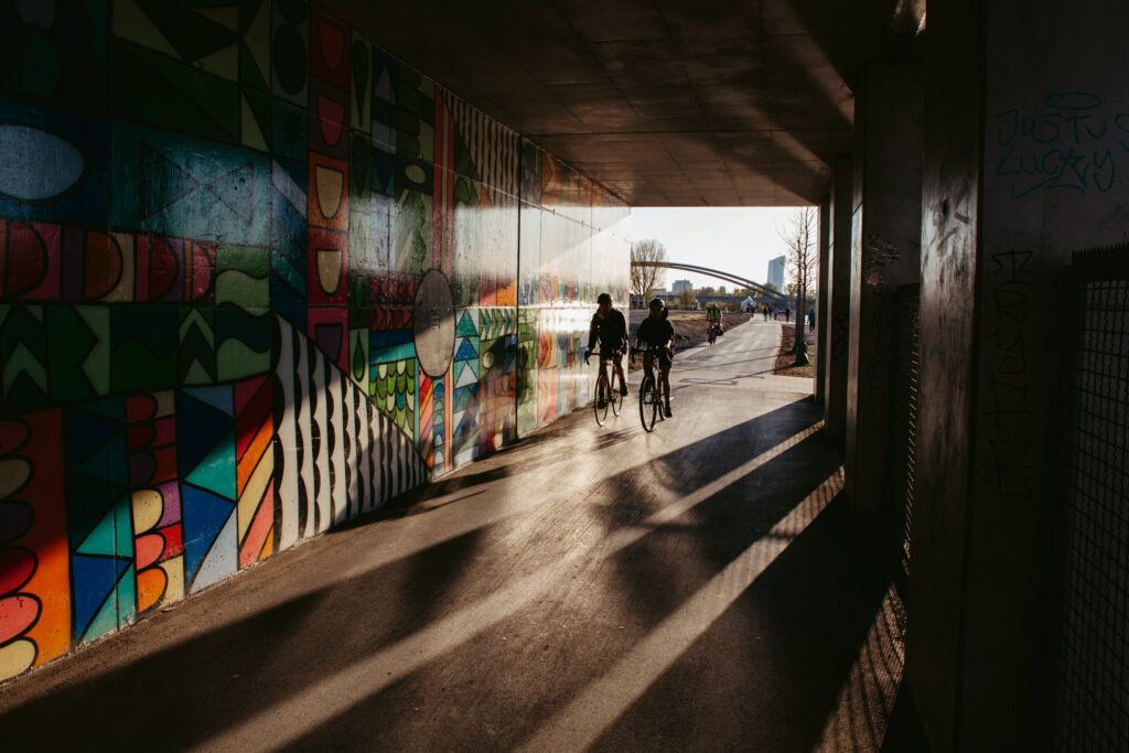 Auf dieser Brücke überquere ich den Main und folge dann dem Radweg entlang der Autobahn. Mein Ziel: Die Toreinfahrt des Großen Riederhof. Im Vorbeifahren auf der Hanauer Landstraße hatte ich sie anderntags aus dem Autofenster gesehen und war ziemlich perplex über das altertümliche Gemäuer im Gewerbegebiet, zwischen Autobahn und Gleisen, auf Armlänge Abstand zu einer Lagerhalle. Es erinnerte mich an mexikanische Architektur in alten Western. War ich da gerade an Werbung für ein spanisches Restaurant vorbei gefahren? Oder an einer stehen gebliebenen Filmkulisse? Wikipedia klärt mich auf: Es ist der letzte Rest des Großen Riederhof, der seit dem Mittelalter als Wehrhof in die Frankfurter Stadtbefestigung einbezogen war. Nachdem man im 19 Jhdt. beim Bau der Hanauer Landstr. eigens einen Straßenknick in Kauf genommen hatte, um ihn zu verschonen, wurde die Kriegsruine in der Nachkriegszeit kurzerhand abgerissen. Wie zur Würdigung dieser unglaublichen Situation bietet mir der Radweg neben der AB hier einen kleinen Aussichtsbalkon. Dann verschluckt mich die graffitiübersähte Autobahnunterführung und spuckt mich an der Riederhofstraße (!) wieder aus.