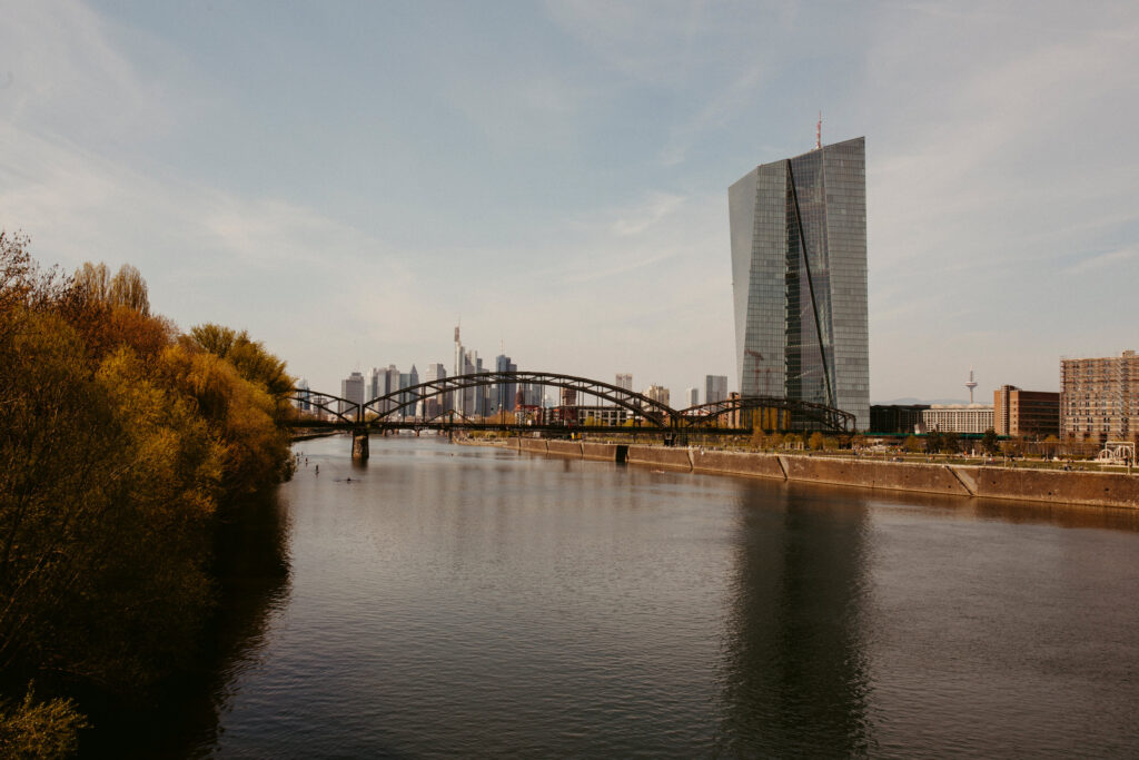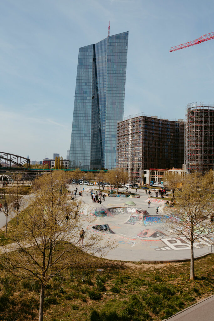 Ich folge dem Nordbecken in voller Länge. Hier, auf der „Landseite“ des Hafenareals, dringt die Innenstadt spürbar an den Hafen heran und große Bürogebäude säumen den Kai. Als ich zur Honsellbrücke gelange, die die Hafeneinfahrt überspannt, ist endgültig Schluss mit Industrieromantik, Zementstaub und Containerbollern. Über den Hafenpark und die Skaterbowl hinweg, blicke ich auf den den Himmel spiegelnden Kristall der EZB (den ich bislang nur aus Bad Banks kannte). Im Familie Montez, dem großartigen Kunstverein unter der Brücke, hole ich mir einen Kaffee und steige die Stufen hinauf auf die Brücke. Am Kreisverkehr auf der Spitze der Hafenhalbinsel mache ich einen kurzen Abstecher hinunter zum ältesten Kiosk der Stadt. Er trägt den Ehrentitel Jöst-Häuschen Nr. 1, benannt nach dem geschäftstüchtigen Adam Jöst, der einst ein ganzes Kioskimperium in Frankfurt besaß, so dass sein Name zum Synonym wurde. Das Jöst-Häuschen Nr. 1 ist heute von Hans-Jürgen Hammerschmiedt gepachtet. Die lange Tradition des Ortes ist ihm wichtig: „Das alte Pissoir, mit dem wir uns unsere kleine Verkehrsinsel teilen, das sollten Sie sich noch ansehen. Und schauen Sie mal hier“ – ich beuge mich über die Theke, um in der Tiefe des Raumes etwas erkennen zu können – „das ist der Fuß einer alten Straßenlaterne. Die ist so dick wie ein Baumstamm und aus massivem Gussstahl, die haben sie nicht weggekriegt, da haben sie sie einfach oben abgesägt und den Stumpf umbaut.“ Ich trete zurück und beginne, die Insel zu umkreisen. Aus dem Teerpappedach des Kioskanbaus schaut der Laternenstumpf tatsächlich heraus wie ein kurzer Schornstein. Ein zur Unkenntlichkeit umgebauter Kiosk von 1912, eine abgesägte Gussstahllaterne, ein verbarrikadiertes Jugenstilpissoir: Es ist wirklich ein kleines, geradezu pariserisches Ensemble, das sich hier an der westlichen Hafeneinfahrt unsichtbar macht, um auf bessere Zeiten zu warten.