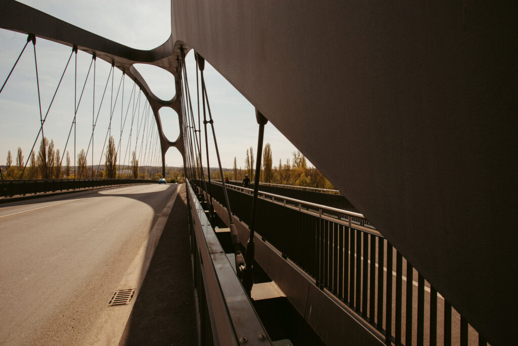 Die Strahlenbergerstraße und anschließend die Auffahrt zur Brücke überqueren (Achtung: Wegen der Baustelle gibt es keine geordneten Übergänge, man muss sich seinen Weg selber suchen!). Auf dem Rad- und Fußweg neben der AB den Main überqueren. Auf dem ersten Treppenabgang die Brücke verlassen. Nach links unter der AB hindurch gehen und gleich links die nächste Treppe zur AB wieder hochgehen. Den Weg auf dieser Seite der AB fortsetzen.